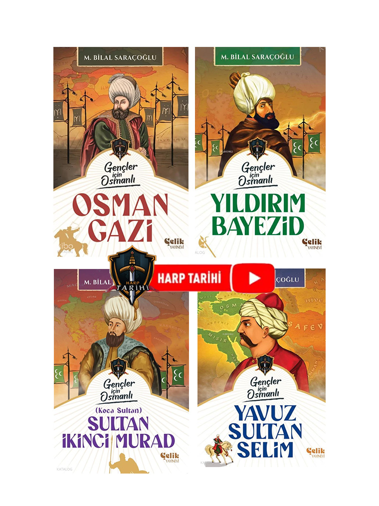 Gençler için hazırlanan bu özel seri, Osmanlı Devleti’nin kuruluşundan yükselişine uzanan destansı süreci dört büyük padişahın hayatı üzerinden ele alıyor. Osman Gazi’nin devletleşme mücadelesinden Yıldırım Bayezid’in hızına, Yavuz Sultan Selim’in stratejik dehasından Sultan İkinci Murad’ın bilge liderliğine kadar tarihin dönüm noktaları, sürükleyici bir harp tarihi anlatımıyla sunuluyor. Tarih bilincini geliştirmeyi amaçlayan bu eserler, hem öğretici hem de heyecan dolu bir okuma deneyimi vaat ...